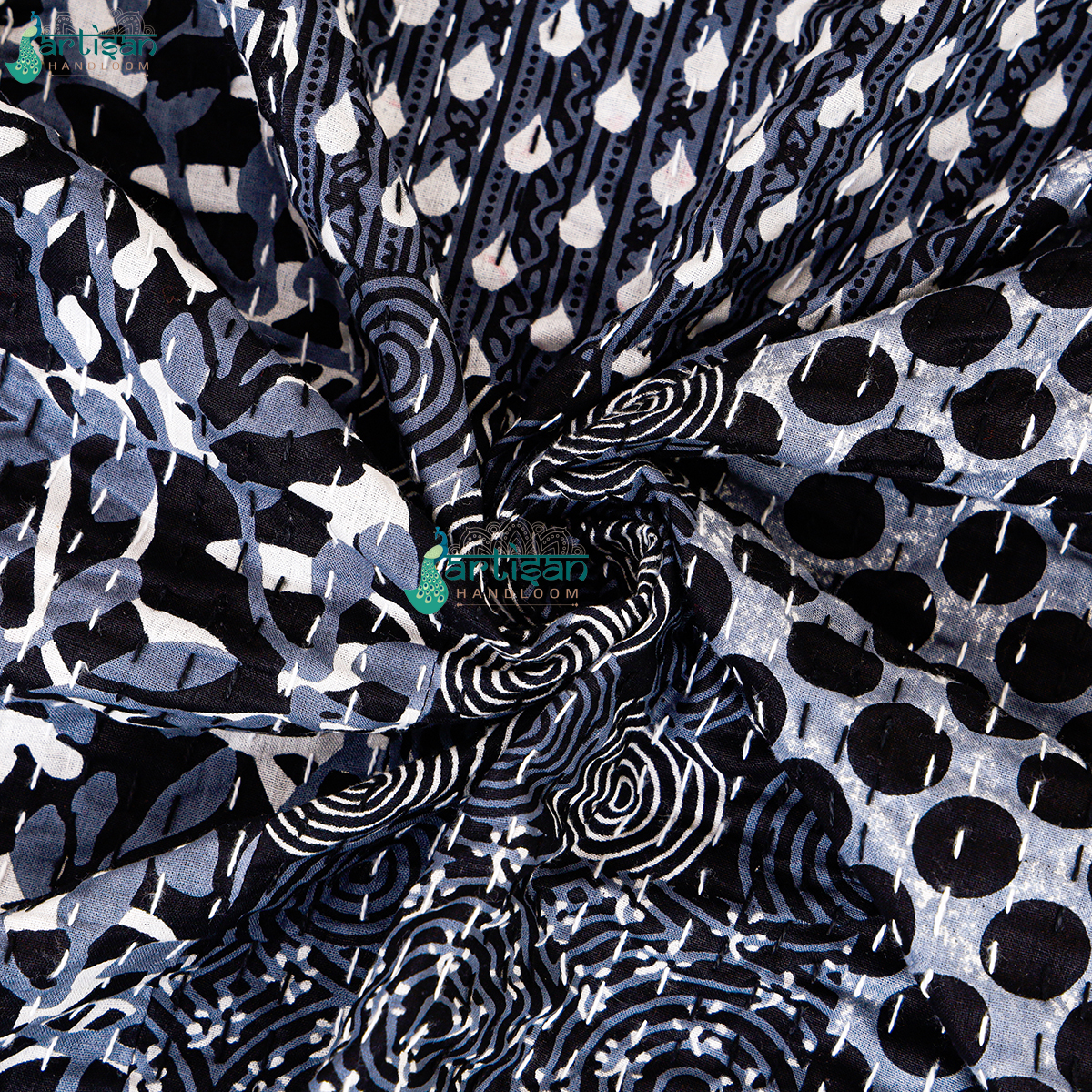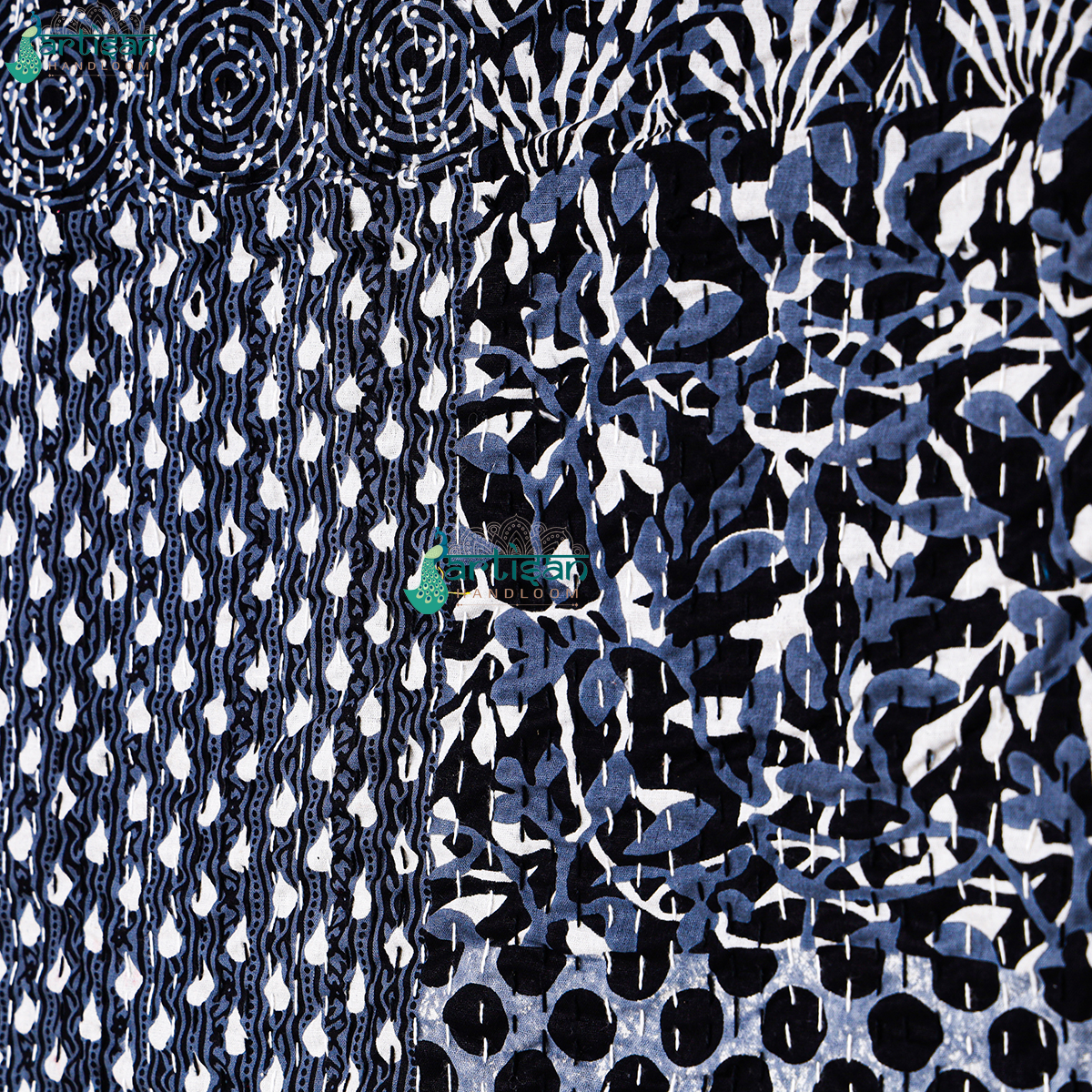 Indigo Black Patchwork Print Kantha Quilt Handmade Throw Cotton Blanket Bedspread